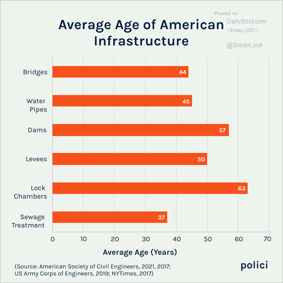 It shows that the USA —- the wealthiest country in the world — has public-works assets whose average is now 50 years ! In other words America’s public civil-structures are half-a-century old … i.e. today’s GenX and GenZ generations of America are using the same roads, bridges and overpasses which their grandfathers had built for themselves two generations ago ! That’s how old and dilapidated America’s public civil-construction assets are today !