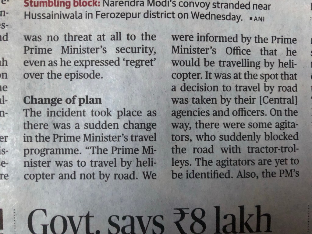 The PM’s convoy on the road gets then obstructed by farmer-rioters in an incident the Home Ministry describes as grave and unacceptable security breach committed by Punjab State government. The PM returns to Delhi cancelling his engagement at a public rally.