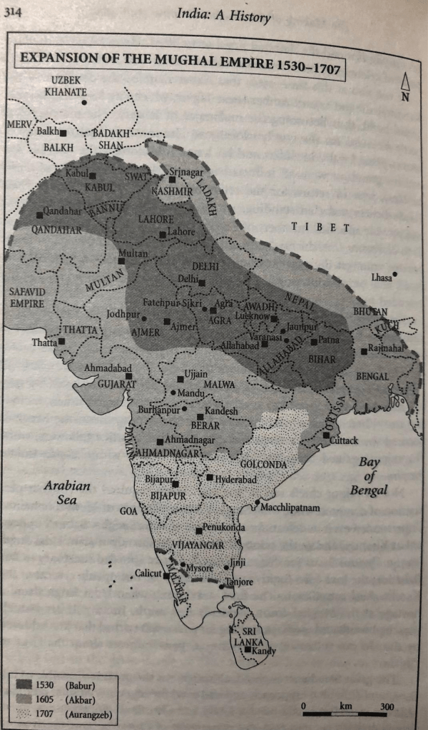 “It was Aurangzeb’s reckless expansion of the Empire into the Deccan, largely fought against the Shia Muslim states of Bijapur and Golconda that did most to exhaust and overstretch the resources of the Empire. (page 27)