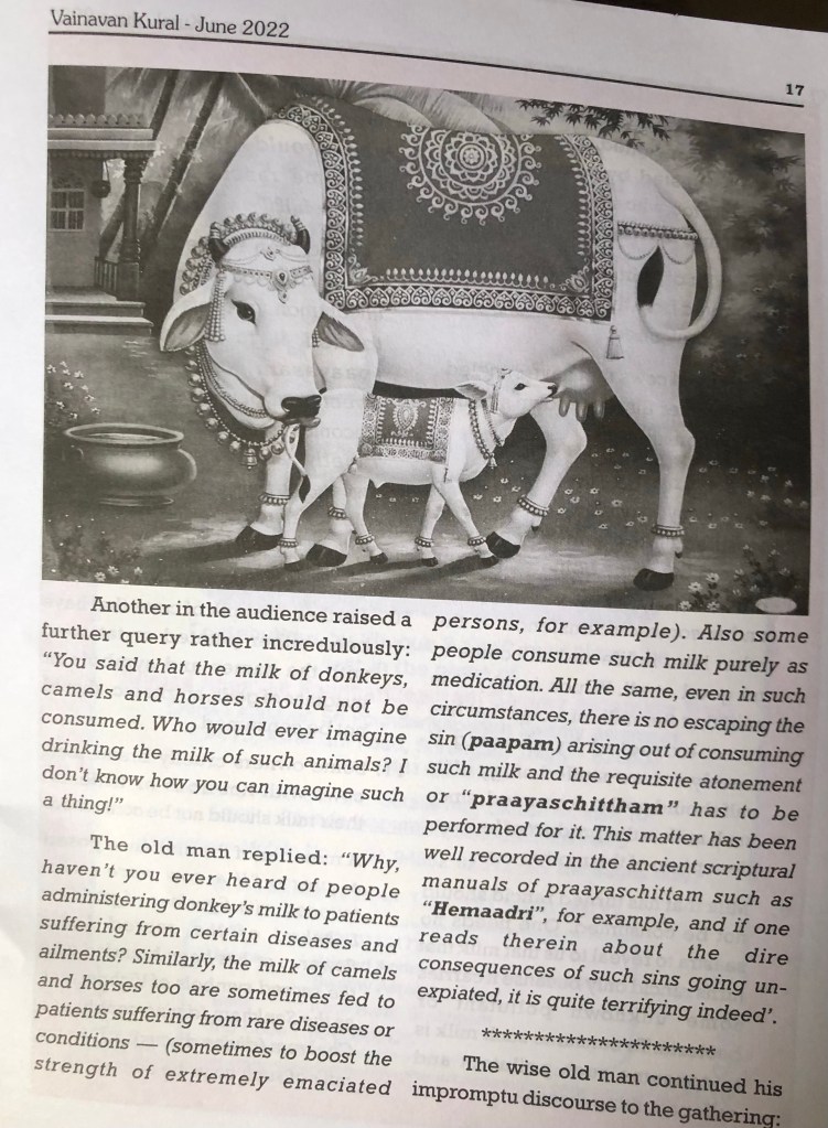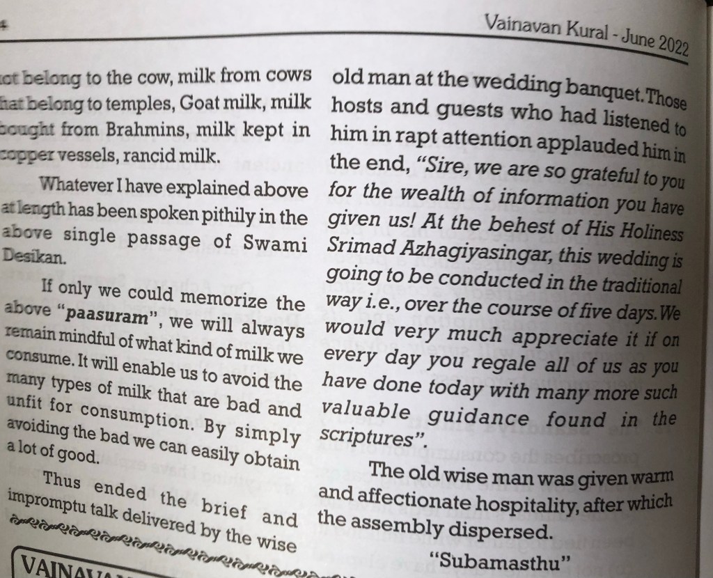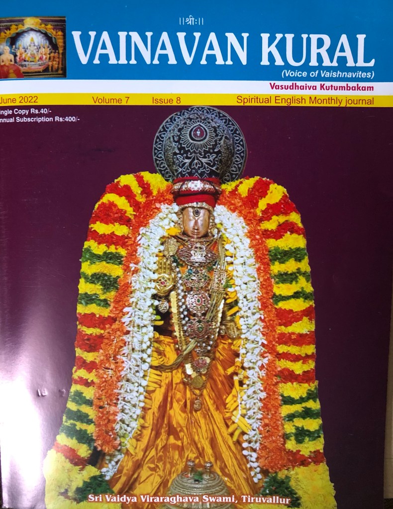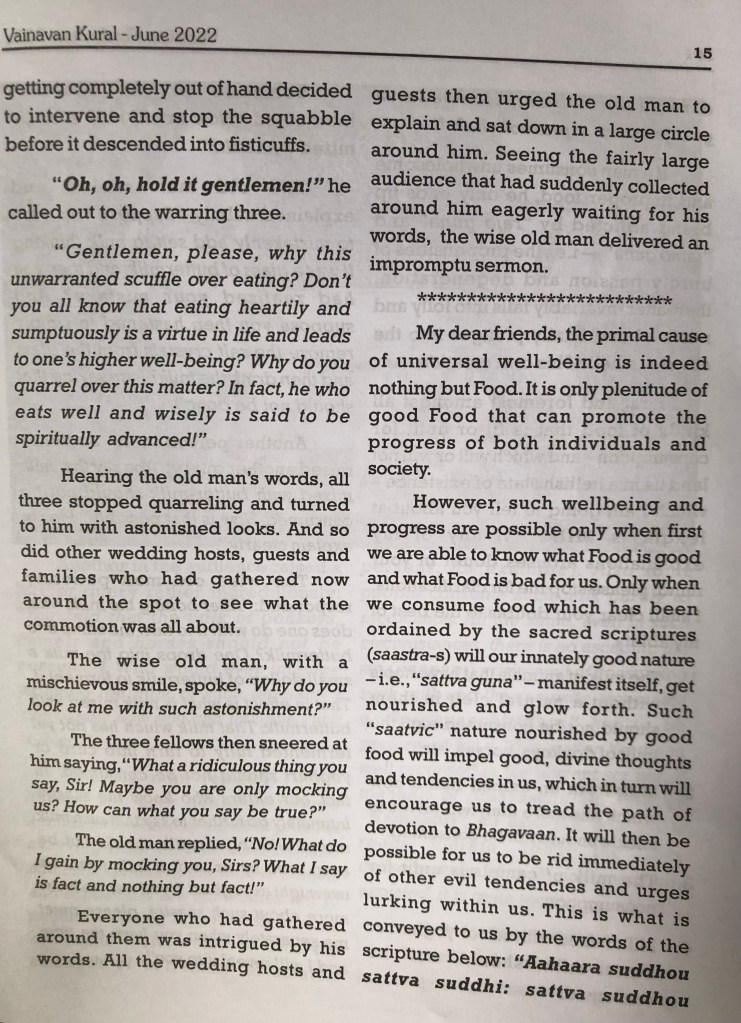 It was my privilege to translate into English the Tamil epistle of HH Sri Mukkur Azhasingar, the 44th Pontiff of Sri Ahobila Mutt, on “A Tiff over Tiffin” (“saapaattu sandai”) and it has been published in the June 2022 issue of “VAINAVAN KURAL ”, “Spiritual English Monthly magazine” published from Chennai.