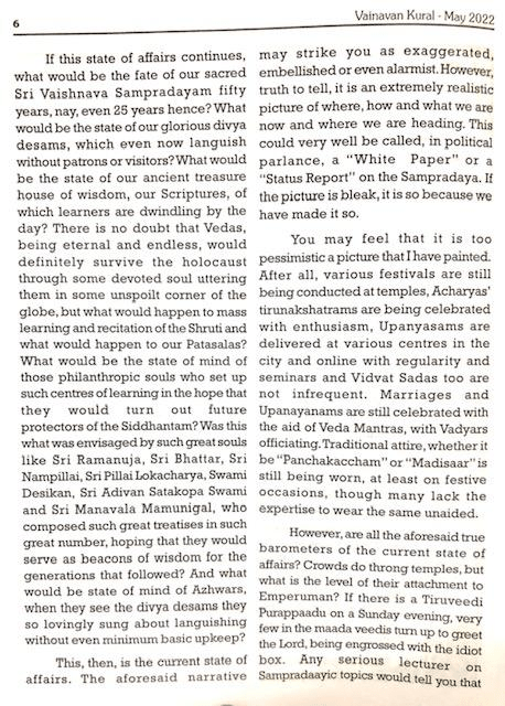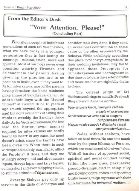 The second outspoken view expressed on the subject is being reproduced below as facsimile again (rather than as extracts). It is an extremely trenchant editorial titled “Your Attention, please!” which appeared in the May’2022 issue (English edition) of the Chennai-city based magazine “Vainavan Kural” (The Voice of the Sri Vaishnava). This piece is extraordinary indeed in that it has without a trace of fear introspected deeply on the troubled self-identity of whole Sri Vaishnava community at large in the present-day and virtually holds up a mirror to its face.