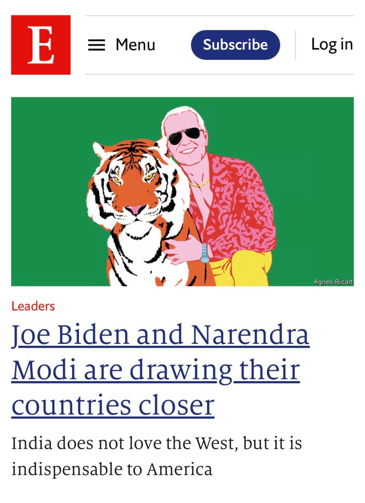 2. India is certainly more democratic and far less liberal than the West. Why? That’s because America is really more a plutocracy than a democracy. And its liberal values are imperialistic — in essence, nature and intent. Which is why whatever form and shape the Biden -Modi Agreement is going to be, it will only be — as the Economist perspicaciously says — “an alignment of interests, not principles”. In other words, it’s going to be a live-in relationship not a marriage .