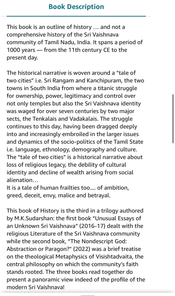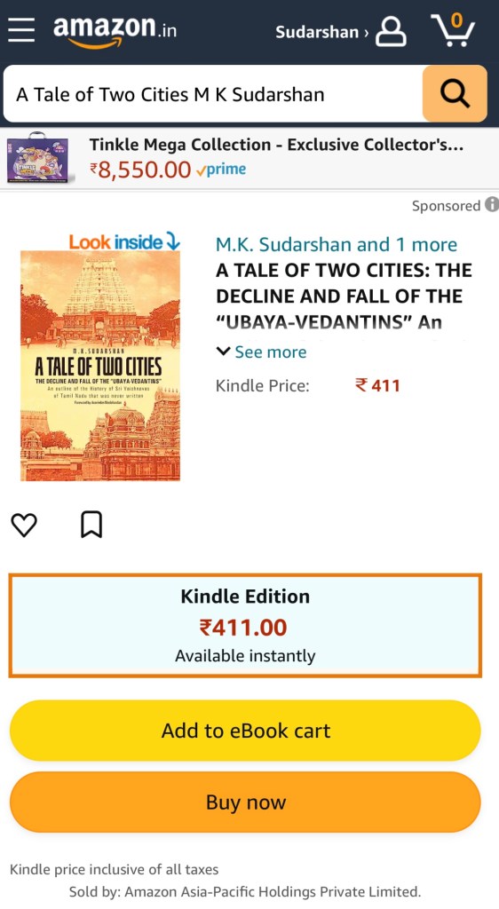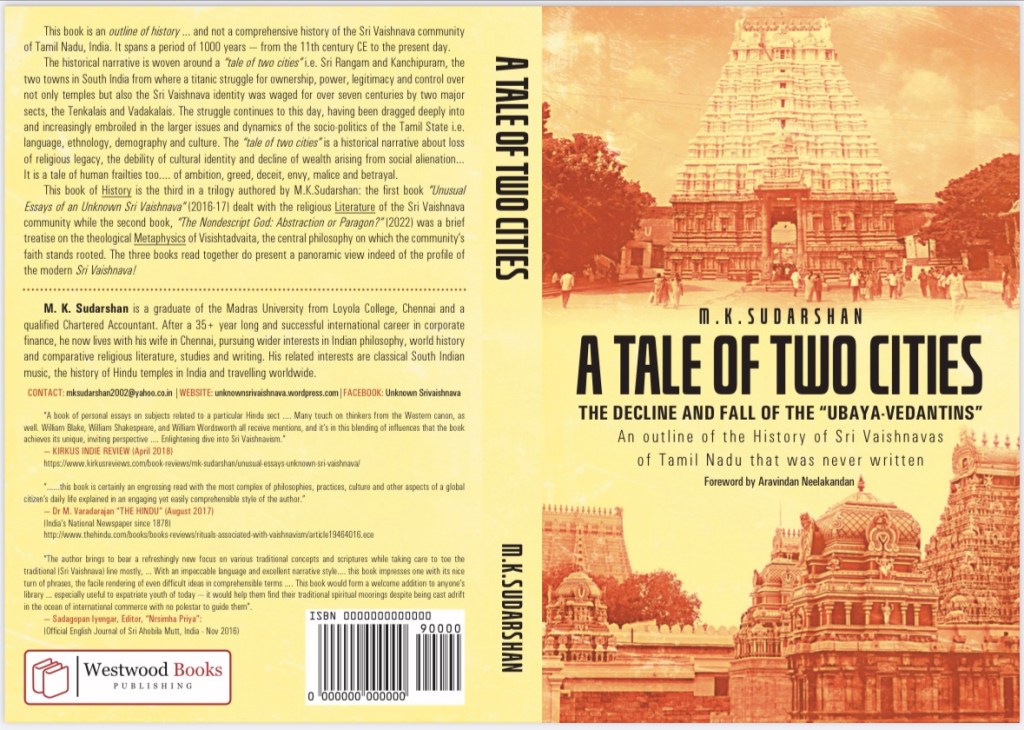 My new book published on the History of the Sri Vaishnava community! KINDLE e-book now Available for sale on Amazon INDIA – Price ₹.411/- only ! Hurry up and buy your copy now ! Posted byJuly 14, 2023Posted inMiscellaneousTags:History, Srivaishnavism, Unknown Sri Vaishnava https://www.amazon.in/dp/B0CBT1GK6G/ref=mp_s_a_1_1?crid=2YORH14LGO4YX&keywords=A%2BTale%2Bof%2BTwo%2BCities%2BM%2BK%2BSudarshan&qid=1689325969&sprefix=a%2Btale%2Bof%2Btwo%2Bcities%2Bm%2Bk%2Bsudarshan%2B%2Caps%2C219&sr=8-1 Sudarshan Madabushi Share on X (Opens in new window) X Share on Facebook (Opens in new window) Facebook Like this:Like Loading...