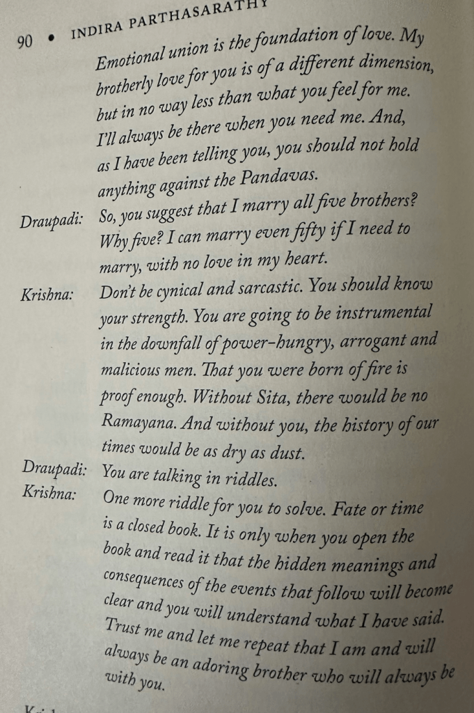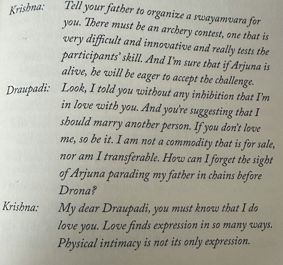 A reader of IP’s novel might want to ask such searching questions while reading the following pages too where the marriage of Draupadi to the Pandava princes is talked about between Kunti, Krishna and Jara: