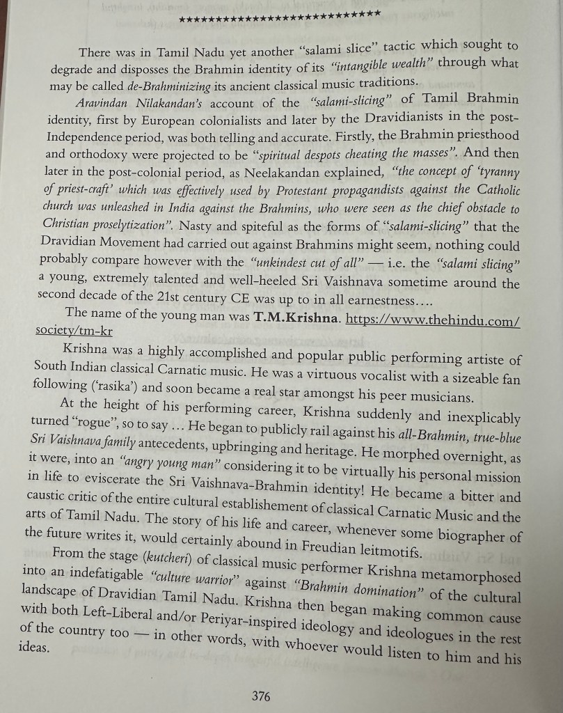 TMK can be likened to that imaginary cook of yours . His music is “extraordinary” but then its “manodharma” is sick, perverted and miasmic. If you want to know why I think so , please turn to Chapter 47 of my published book “The Tale of Two Cities” (2023). Please also see below the excerpted pages of the book. There I have explained myself.