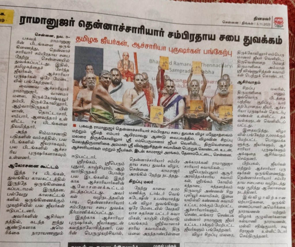 If this initiative — announced with such public fanfare — had been not named itself with the exclusionary term “tennaachaarya” , it would have been warmly welcomed by all Sri Vaishnavas. Since this new organisation however is calling itself “tennaachaarya sampradaya Sabha” purportedly dedicated to propagating the historic 74 simhaasanaadipathi spiritual heirs , it reduces itself unfortunately to just yet another narrow , parochial sectarian outfit engaged in meaningless inter-sectarian polemics .