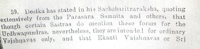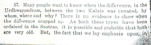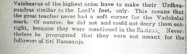 For, the Tenkalai sect, the assertions of the Vadakalais are wholly anathema and false. The noted Tenkalai scholar of Kanchipuram, Sri. Prativadabhayankara Annagarachariar wrote a polemical work titled “Ramanujadayapatram” (1951) in which he claimed that Vedanta Desika himself endorsed only the Tenkalai tiruman and which itself proved that since the days of Sri Ramanuja, the only insignia of Sri Vaishnavism was the Tenkalai naamam with slight variations in form and shape. He implied that the Vadakalai naamam came into vogue only around the 18th century CE when the Vadakalai-Tenkalai sectarian clashes commenced. Below are excerpts from Sri Annangarachariar’s treatise: