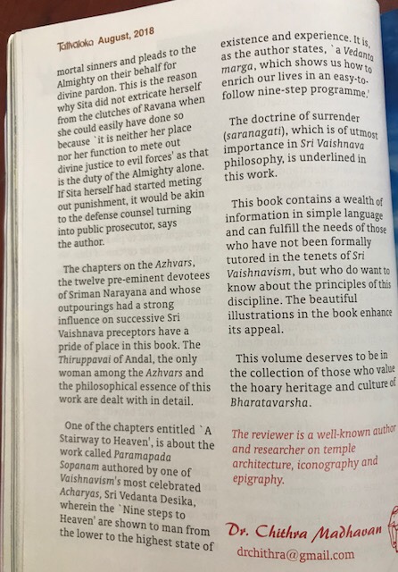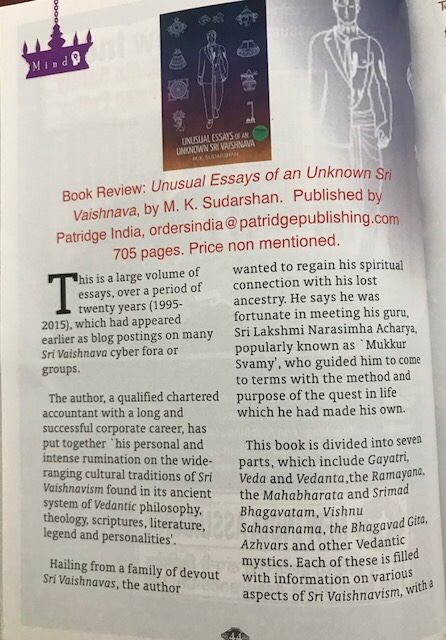 “The author brings to bear a refreshingly new focus on various traditional concepts and scriptures while taking care to toe the traditional (Sri Vaishnava) line mostly, … With an impeccable language and excellent narrative style…. this book impresses one with its nice turn of phrases, the facile rendering of even difficult ideas in comprehensible terms …. This book would form a welcome addition to anyone’s library … especially useful to expatriate youth of today — it would help them find their traditional spiritual moorings despite being cast adrift in the ocean of international commerce with no polestar to guide them”.