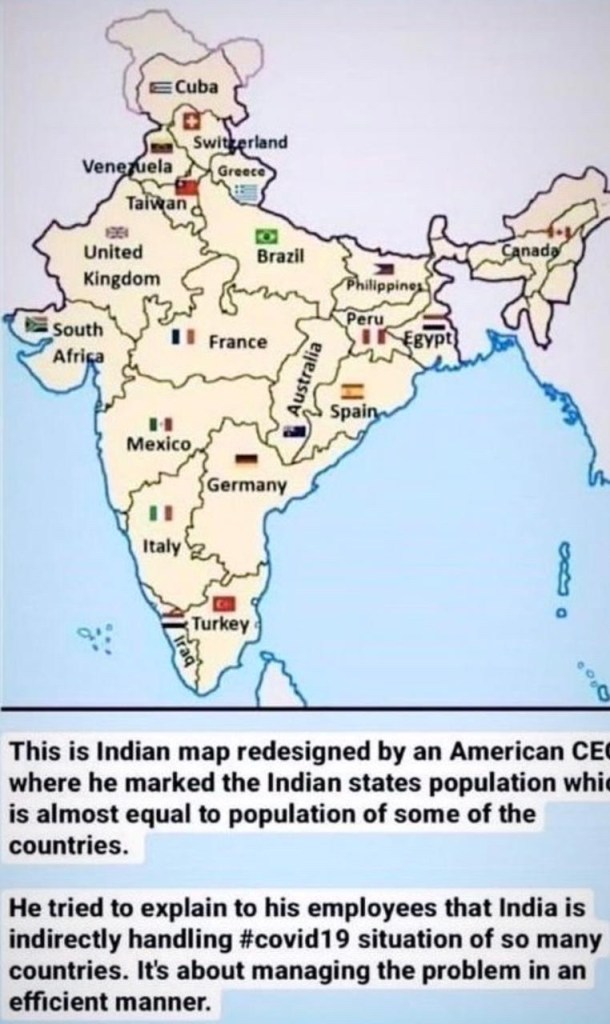A few days ago, the map of India below was forwarded to me on a WhatsApp Group forum. It depicts the size of populations in states of India as compared to those of whole other nations in the world. It was a very interesting perspective that made me appreciate the real dimensions of the humongous Covid problem that we in our country have to deal with.